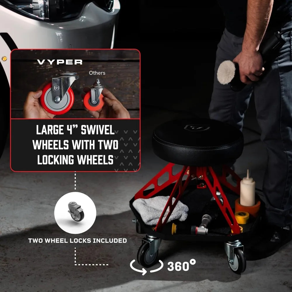 The Vyper Robust Steel Pro garage stool features a thick, industrial foam seat that provides hours of comfort, perfect for automotive, DIY, and detailing tasks.