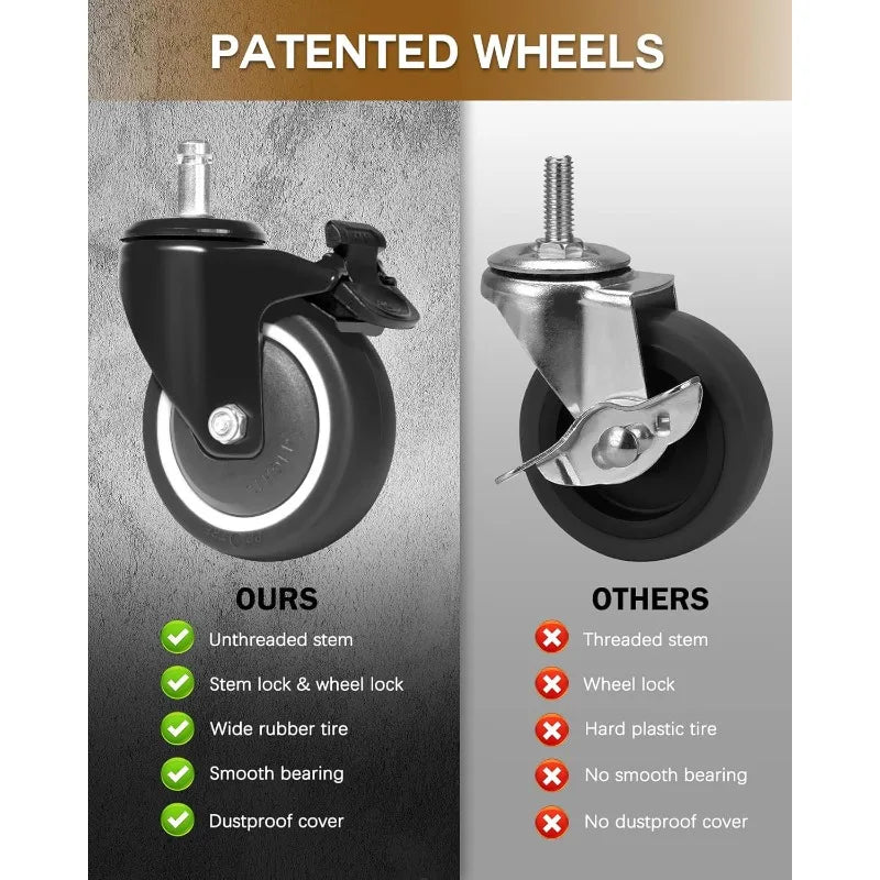 Innovative Wheels: No loose threaded wheels; the 3-inch rubber tires ensure smooth movement with minimal noise; double brakes provide secure stopping that's easy to operate.