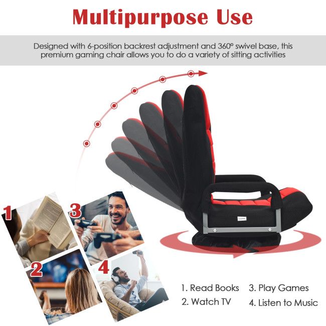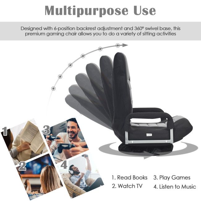 Floor chairs are necessary for people who are used to sitting on the floor. This folding floor gaming chair; which strikes a balance between increased comfort and easy storage; is; without a doubt; an excellent choice for you. It has an adjustable 6-position backrest that allows you to choose your preferred angle and relax comfortably. Swivels in all directions to assist you in quickly turning around your body. It is built to provide a comfortable floor sitting experience by adhering to the ergonomic concept; as shown by the user-friendly armrest; spacious seat; and high backrest that fits well with your body curve. This floor chair will suit your needs if you want to play games; read books; talk; or watch TV. There is no need to assemble it; and it is also quick to store; providing you with a great deal of convenience. It's also essential to pick a breathable mesh fabric with a soft sponge.