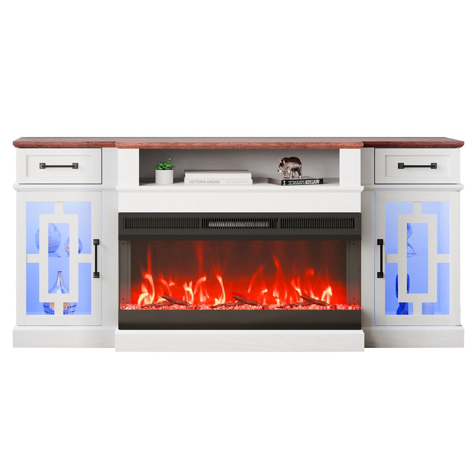 VEVOR 80" Fireplace TV Stand, Media Storage Corner with 36" Fireplace, Storage Drawers & Cabinets, Vintage TV Console Table with 20 LED Lights, Remote Control & Timer for Living Room, Brown & White